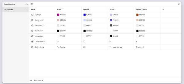 Thereafter we started creating local variables to support different brands and theming. This included different colors, corner radiuses etc. This was done through using aliases for the colors such as Background1 and assigning different colors to Background1 depending on brand and theme. See image below,​ due to corporate confidentiality the image below is a much simpler fictive example and not the real work.